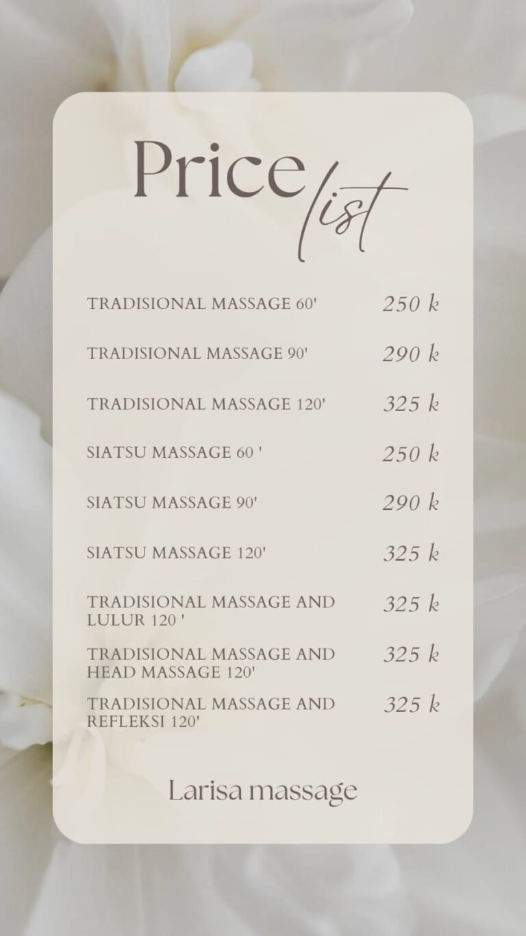 Larisa Massage adalah layanan pijat panggilan terpercaya yang beroperasi di Surabaya dan sekitarnya. Kami berkomitmen untuk memberikan pelayanan terbaik dengan terapis yang profesional dan ramah. Kepuasan dan kenyamanan Anda adalah prioritas utama kami